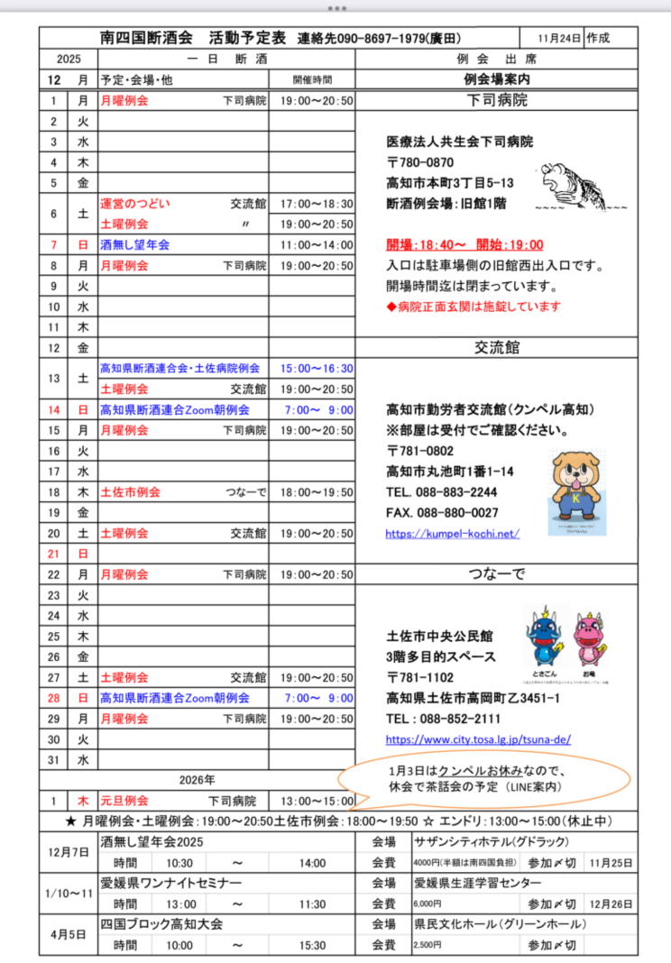 ※南四国断酒会活動予定表12月をUPしました。 (2025.11.30更新)