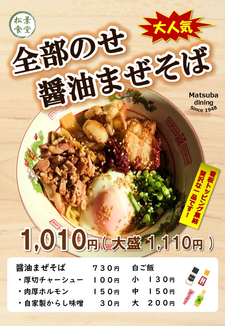 定番メニューは和風出汁が効いた「醤油ラーメン」で、「鍋焼系」、「醤油まぜそば」、